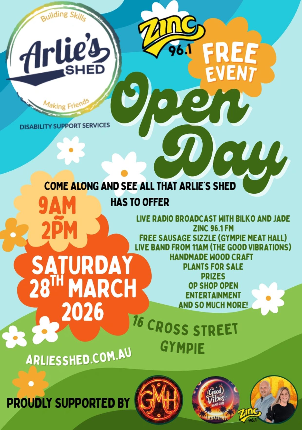 LIVE RADIO BROADCAST WITH BILKO AND JADE ZINC 96.1 FM FREE SAUSAGE SIZZLE (GYMPIE MEAT HALL) LIVE BAND FROM 11AM (THE GOOD VIBRATIONS) HANDMADE WOOD CRAFT PLANTS FOR SALE PRIZES OP SHOP OPEN ENTERTAINMENT AND SO MUCH MORE!